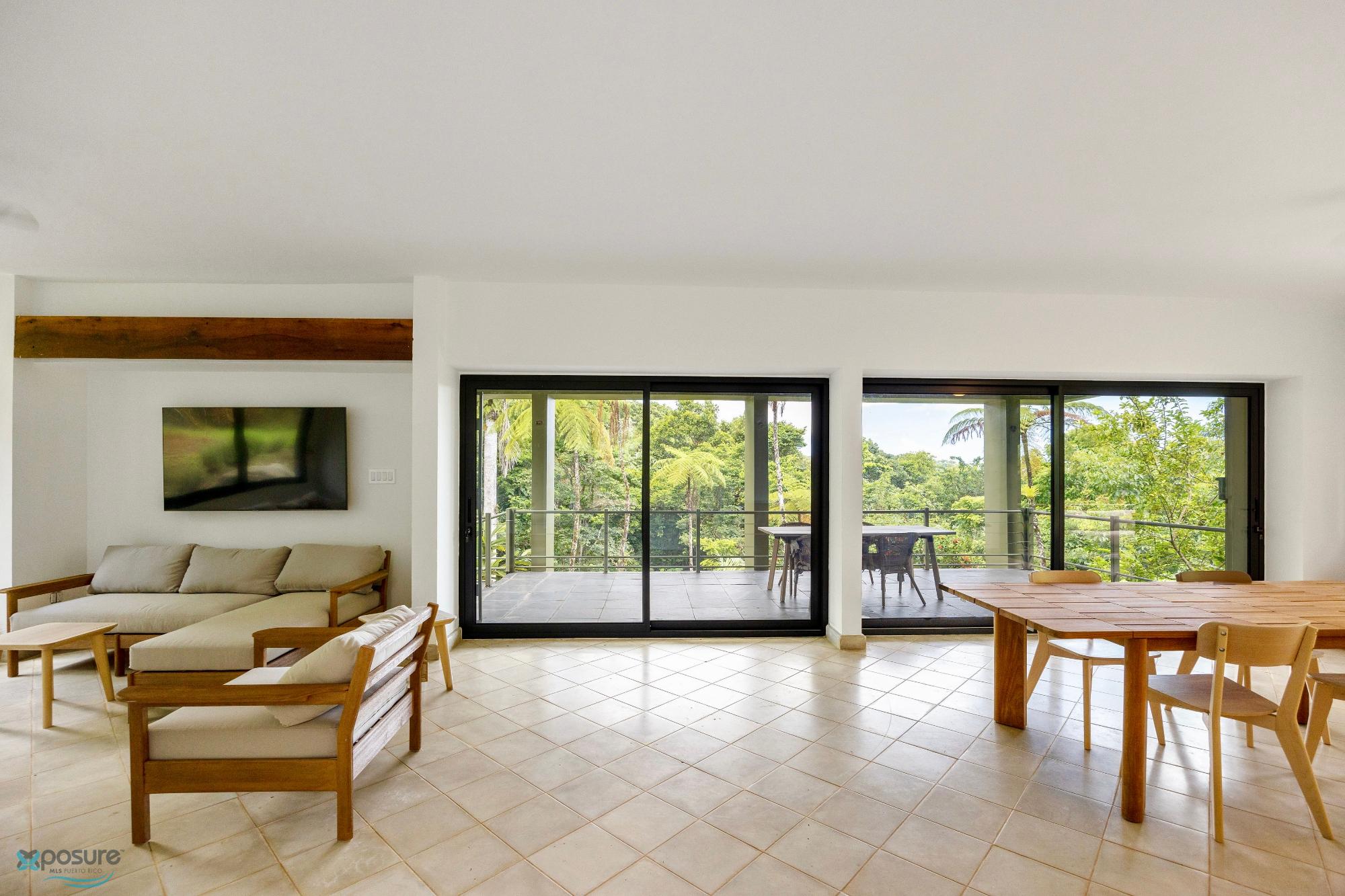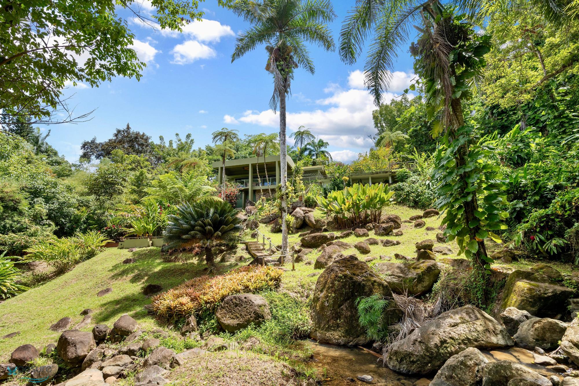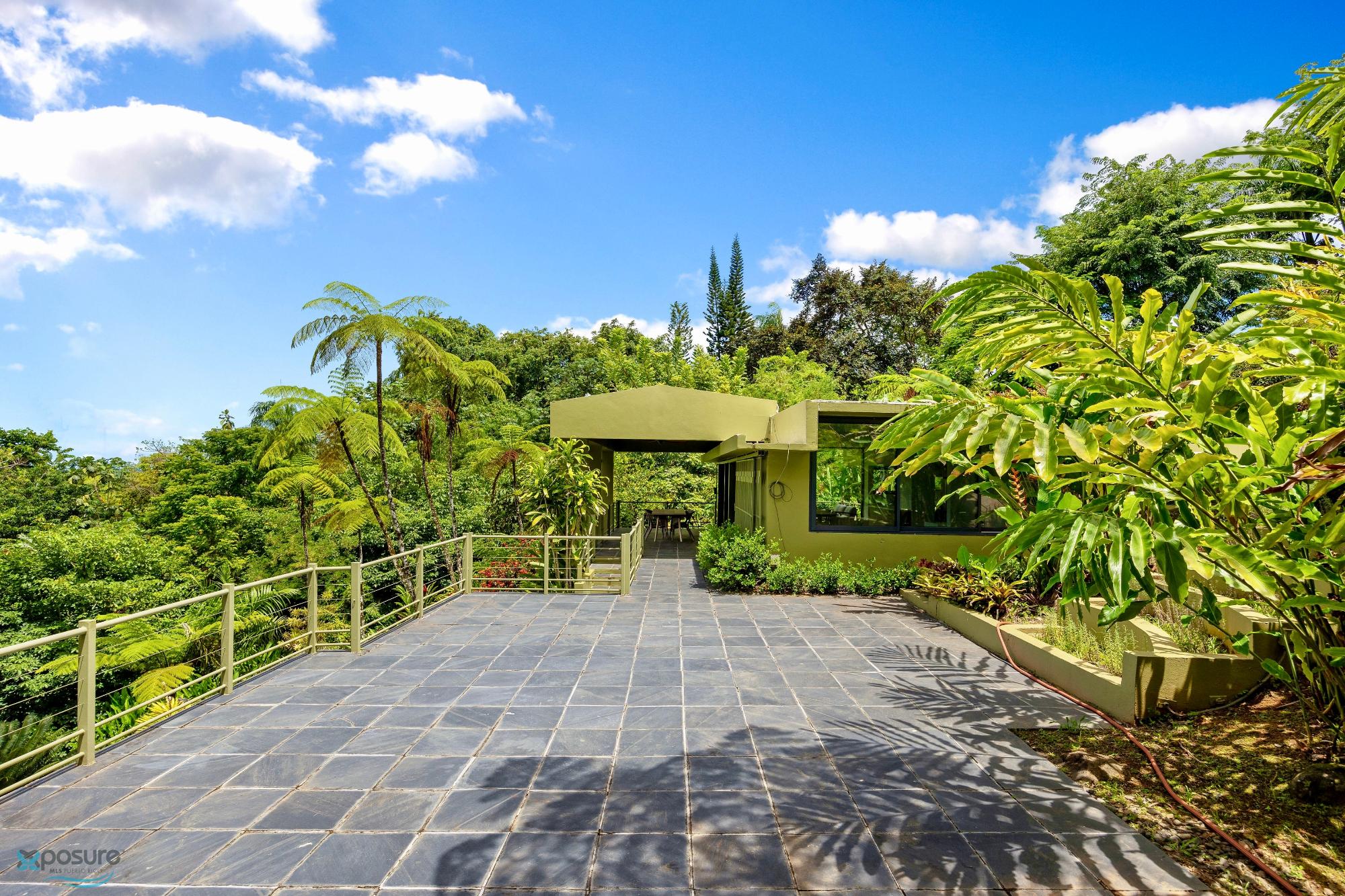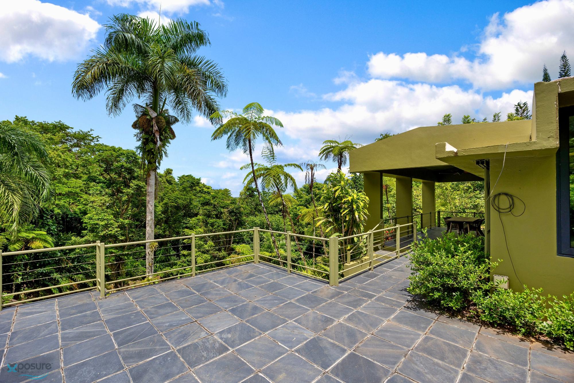 Embrace modern tropical living in this stunning 3-bedroom, 3-bath residence located in the lush hills of Mameyes II, Río Grande. Designed in a contemporary tropical style, this home features approximately 2,350 square feet of interior space and 1,500 square feet of terraces and balconies, offering seamless integration between indoor and outdoor living. Expansive glass panels and open-concept spaces invite natural light and panoramic views of the surrounding rainforest, while multiple terraces provide ideal settings for entertaining or peaceful relaxation. Set on over 3 acres of vibrant greenery, this tranquil retreat offers privacy and serenity just minutes from El Yunque National Forest, Río Grande’s pristine beaches, and local dining. Perfect as a primary residence, vacation home, or income-generating property, this home beautifully combines modern comfort with Puerto Rico’s natural beauty..