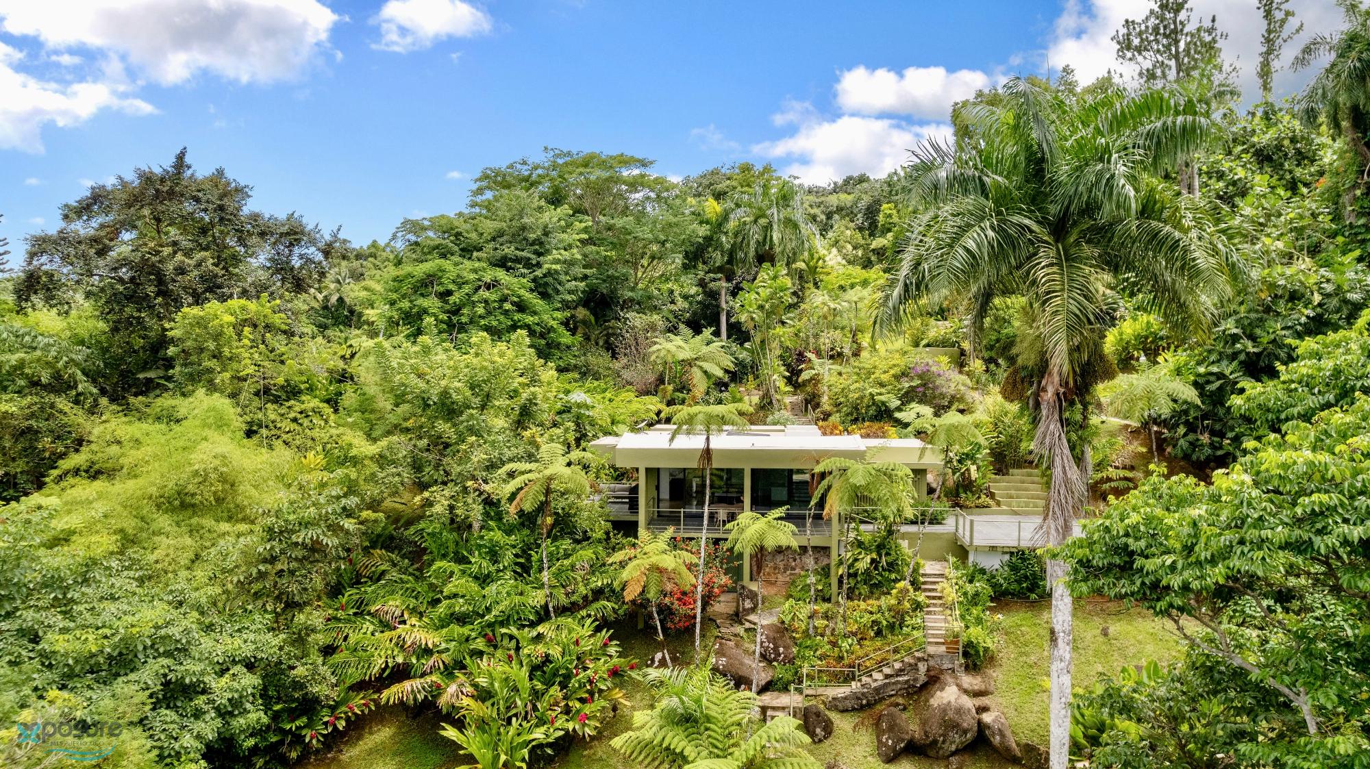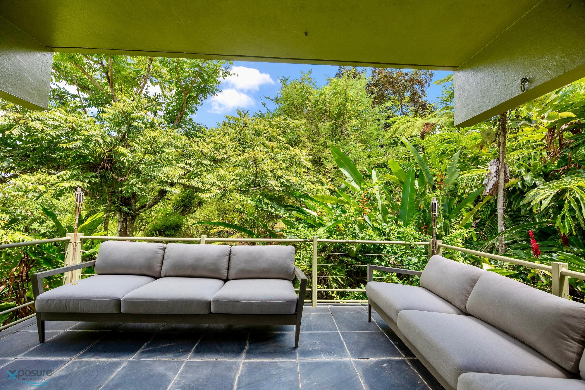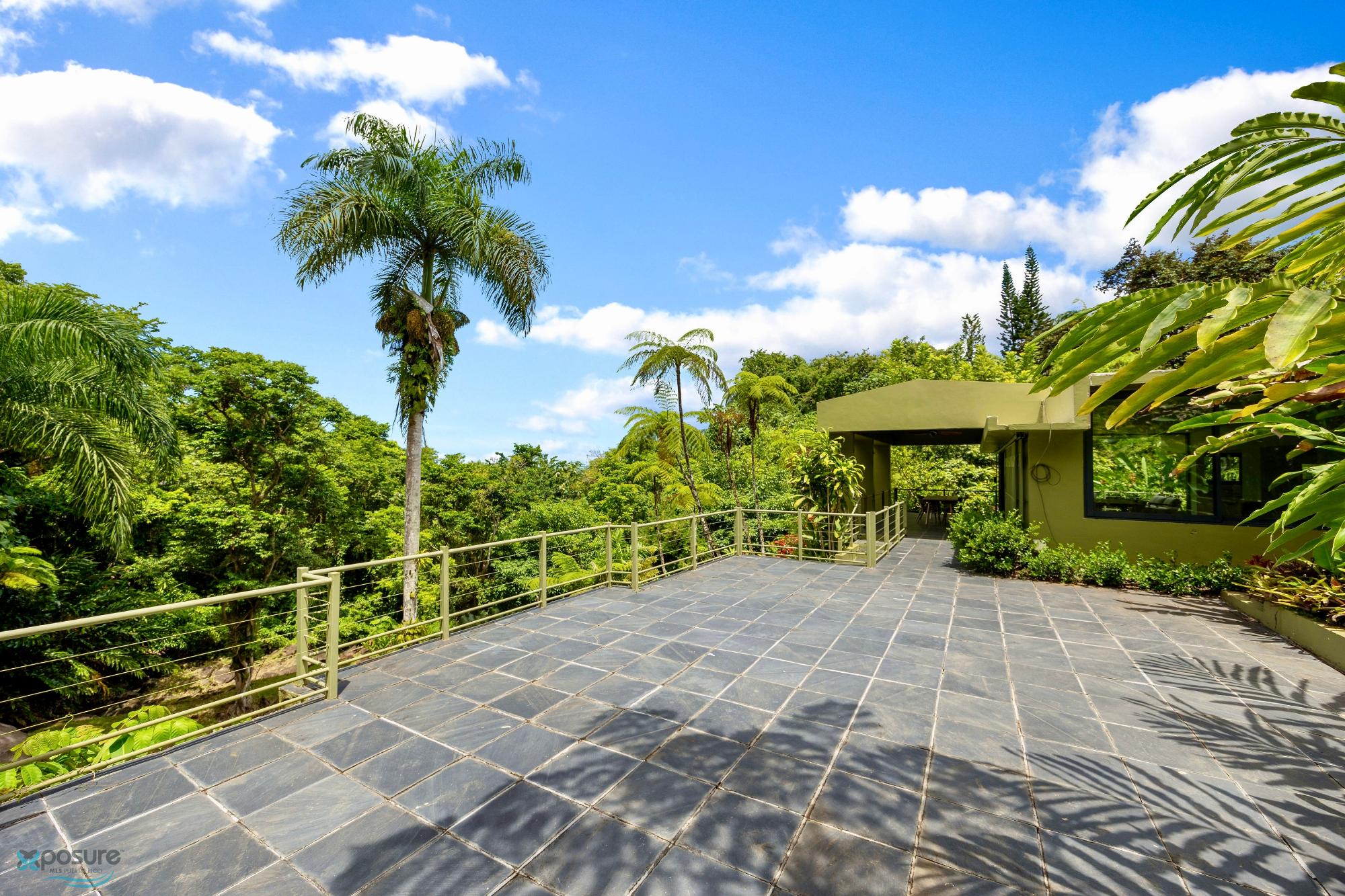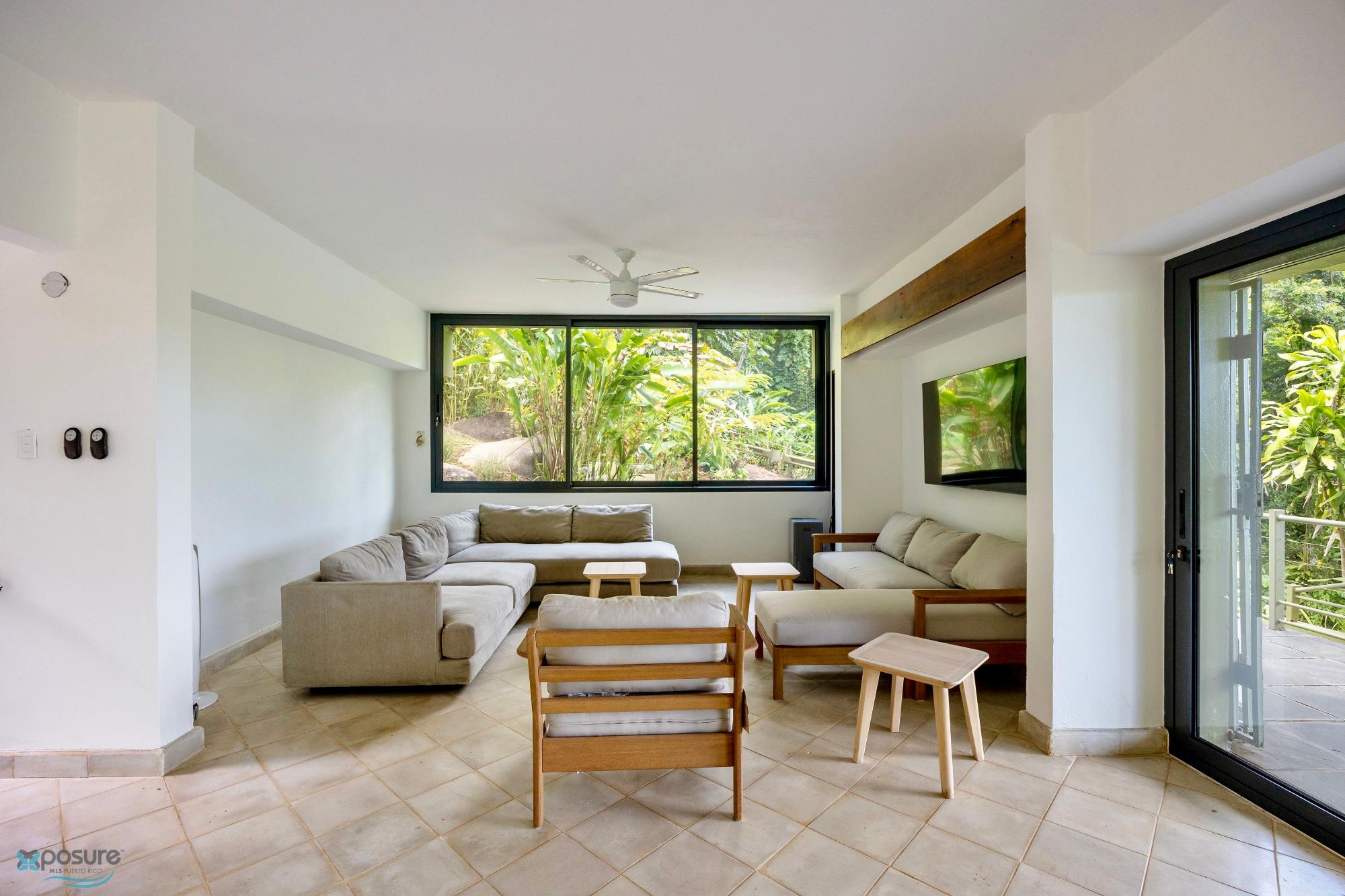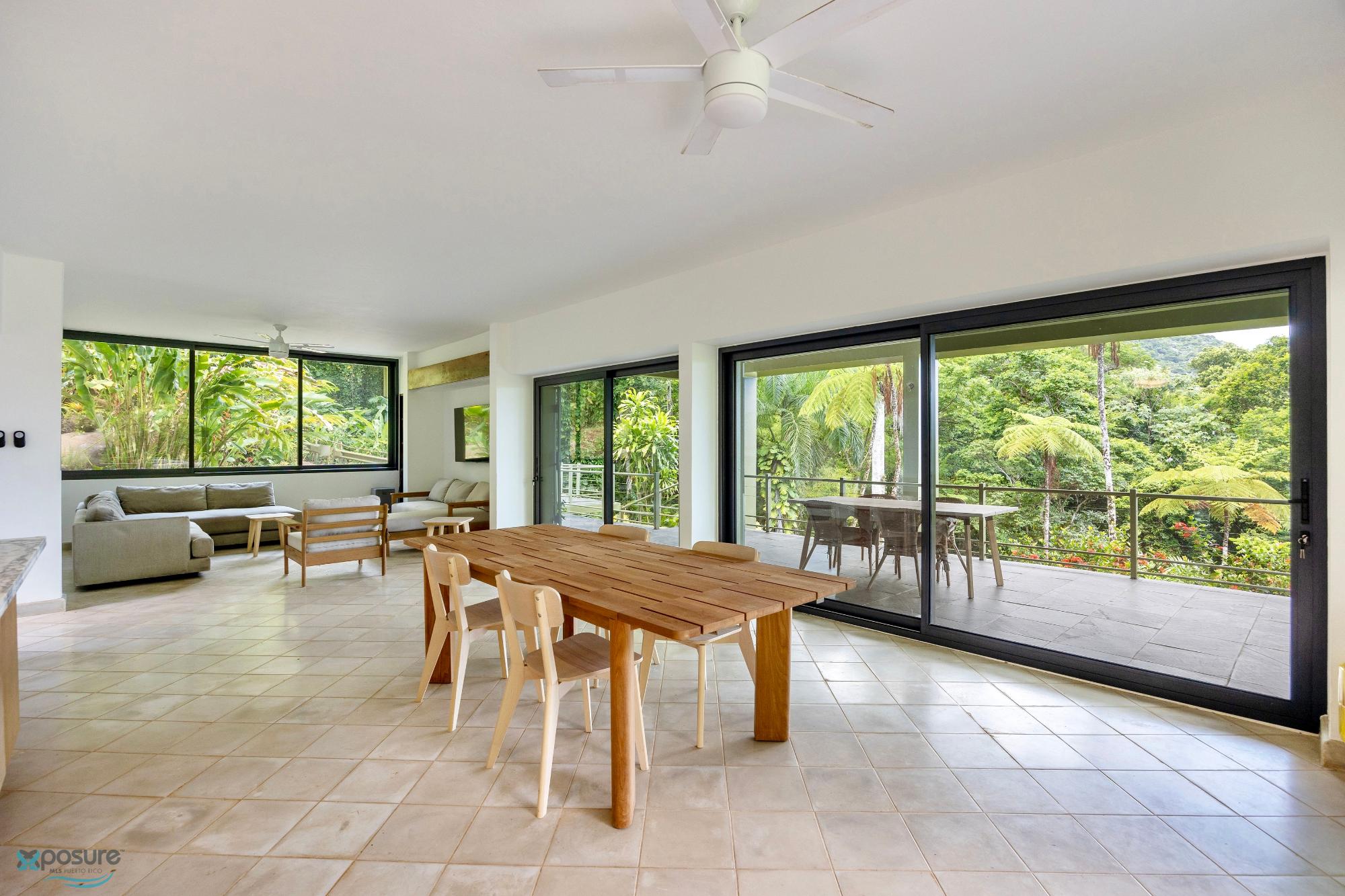 Embrace modern tropical living in this stunning 3-bedroom, 3-bath residence located in the lush hills of Mameyes II, Río Grande. Designed in a contemporary tropical style, this home features approximately 2,350 square feet of interior space and 1,500 square feet of terraces and balconies, offering seamless integration between indoor and outdoor living. Expansive glass panels and open-concept spaces invite natural light and panoramic views of the surrounding rainforest, while multiple terraces provide ideal settings for entertaining or peaceful relaxation. Set on over 3 acres of vibrant greenery, this tranquil retreat offers privacy and serenity just minutes from El Yunque National Forest, Río Grande’s pristine beaches, and local dining. Perfect as a primary residence, vacation home, or income-generating property, this home beautifully combines modern comfort with Puerto Rico’s natural beauty..
