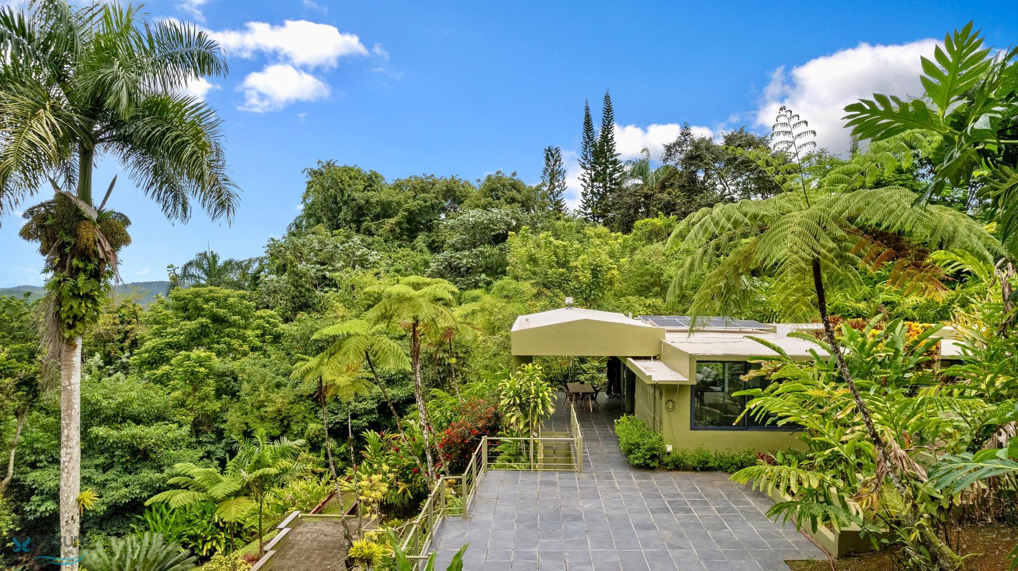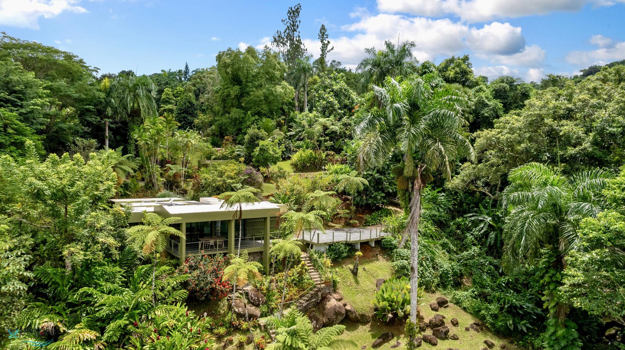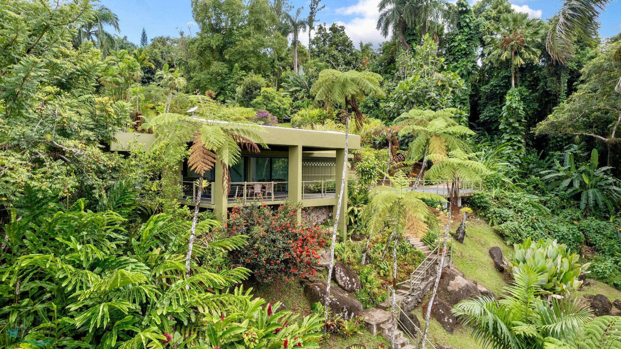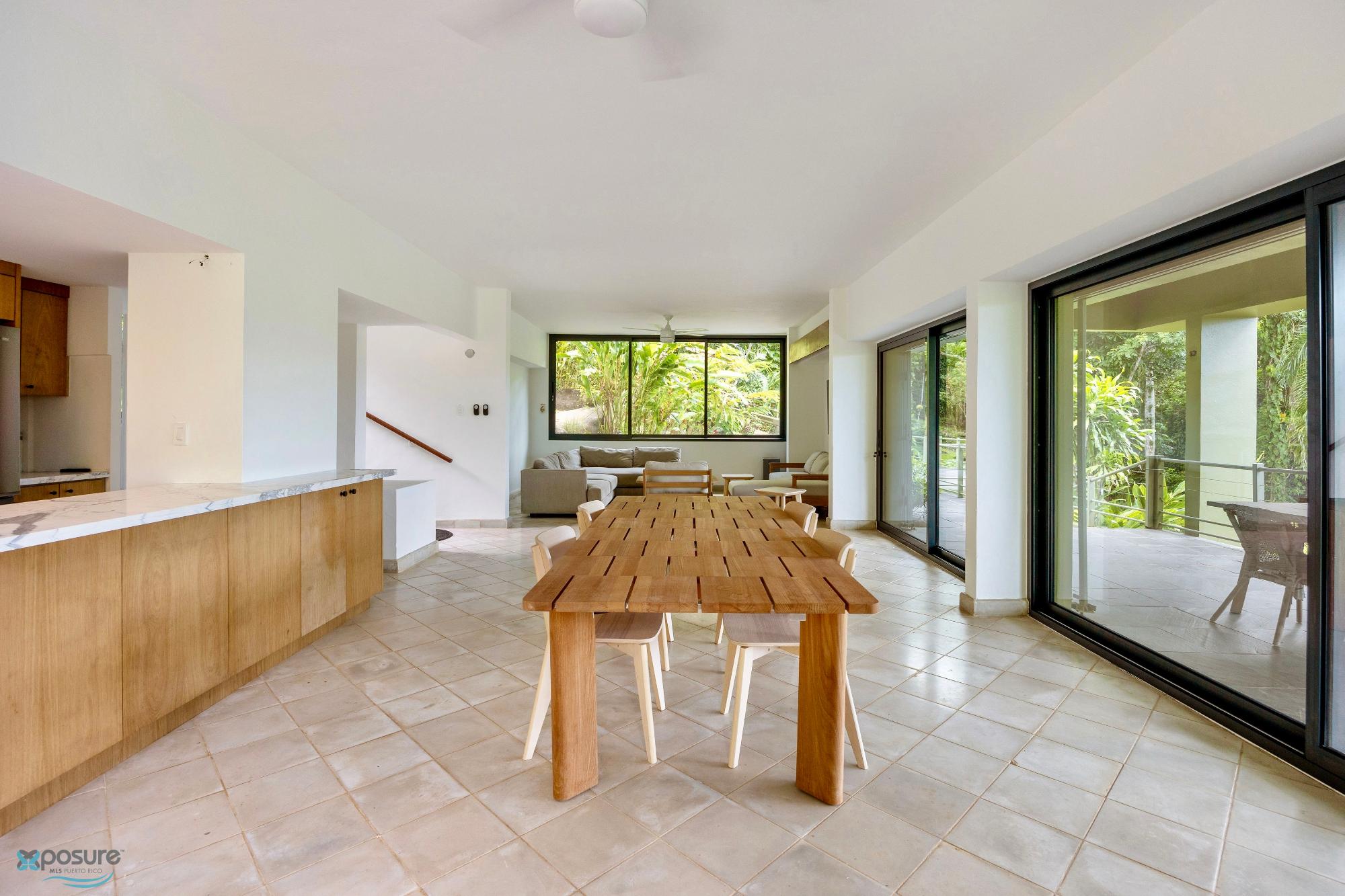 Embrace modern tropical living in this stunning 3-bedroom, 3-bath residence located in the lush hills of Mameyes II, Río Grande. Designed in a contemporary tropical style, this home features approximately 2,350 square feet of interior space and 1,500 square feet of terraces and balconies, offering seamless integration between indoor and outdoor living. Expansive glass panels and open-concept spaces invite natural light and panoramic views of the surrounding rainforest, while multiple terraces provide ideal settings for entertaining or peaceful relaxation. Set on over 3 acres of vibrant greenery, this tranquil retreat offers privacy and serenity just minutes from El Yunque National Forest, Río Grande’s pristine beaches, and local dining. Perfect as a primary residence, vacation home, or income-generating property, this home beautifully combines modern comfort with Puerto Rico’s natural beauty..