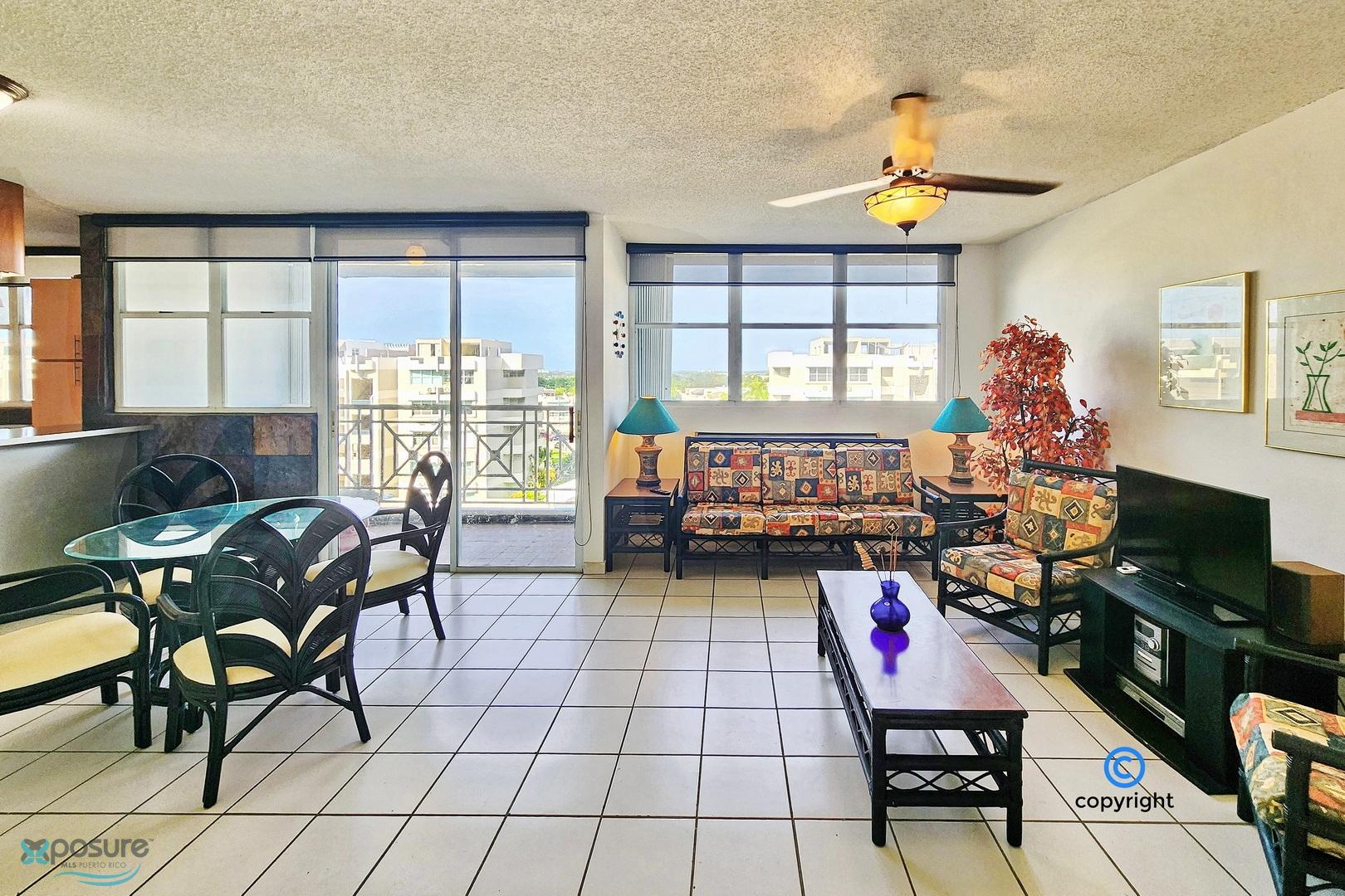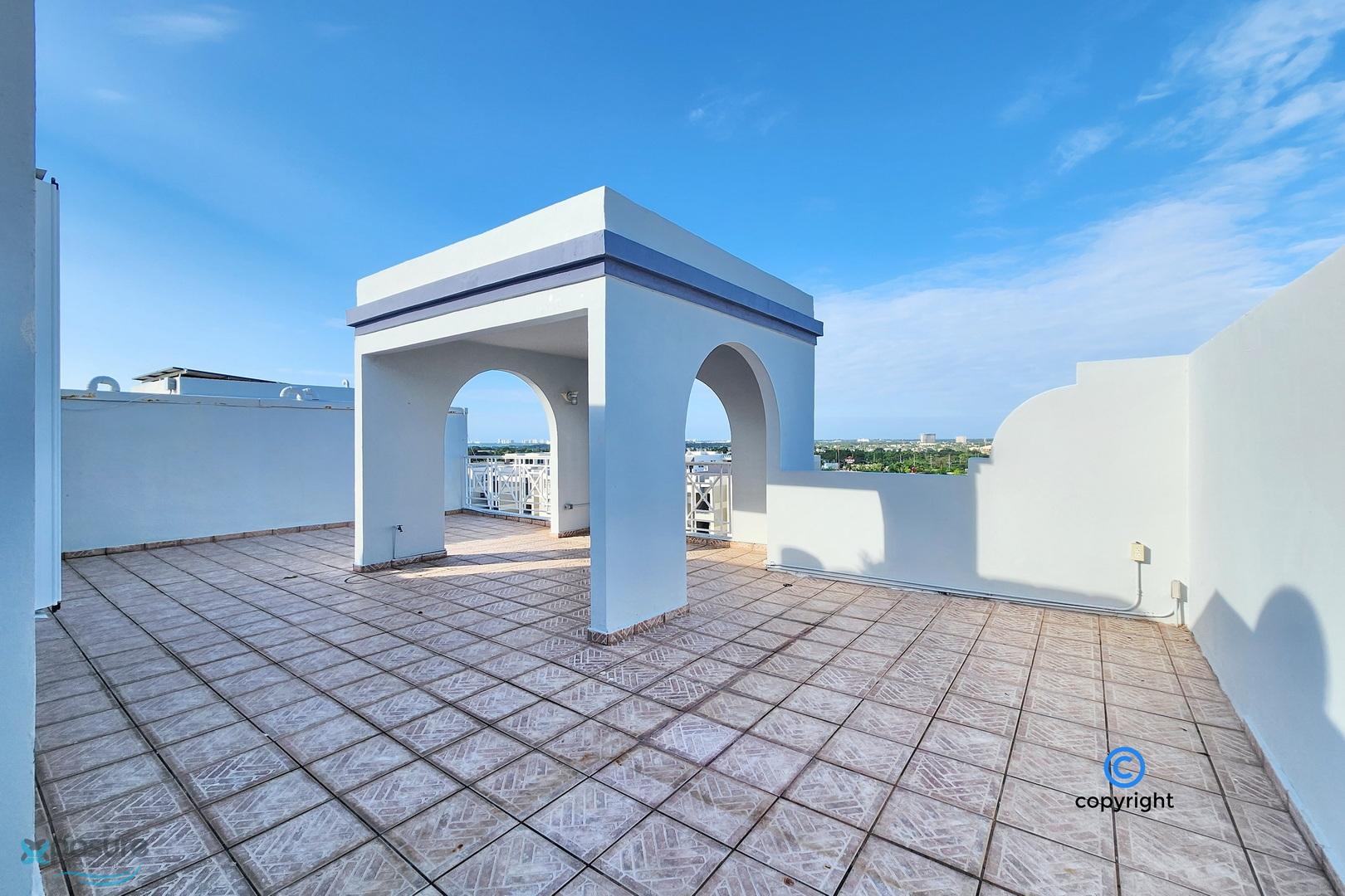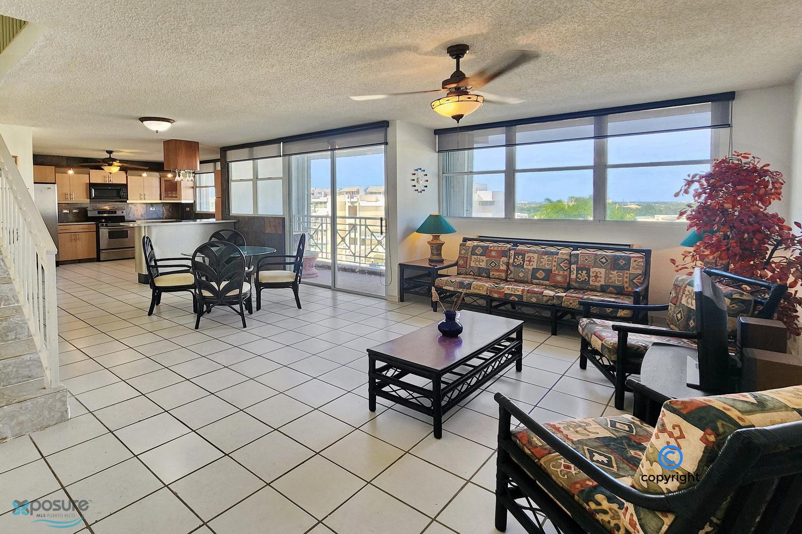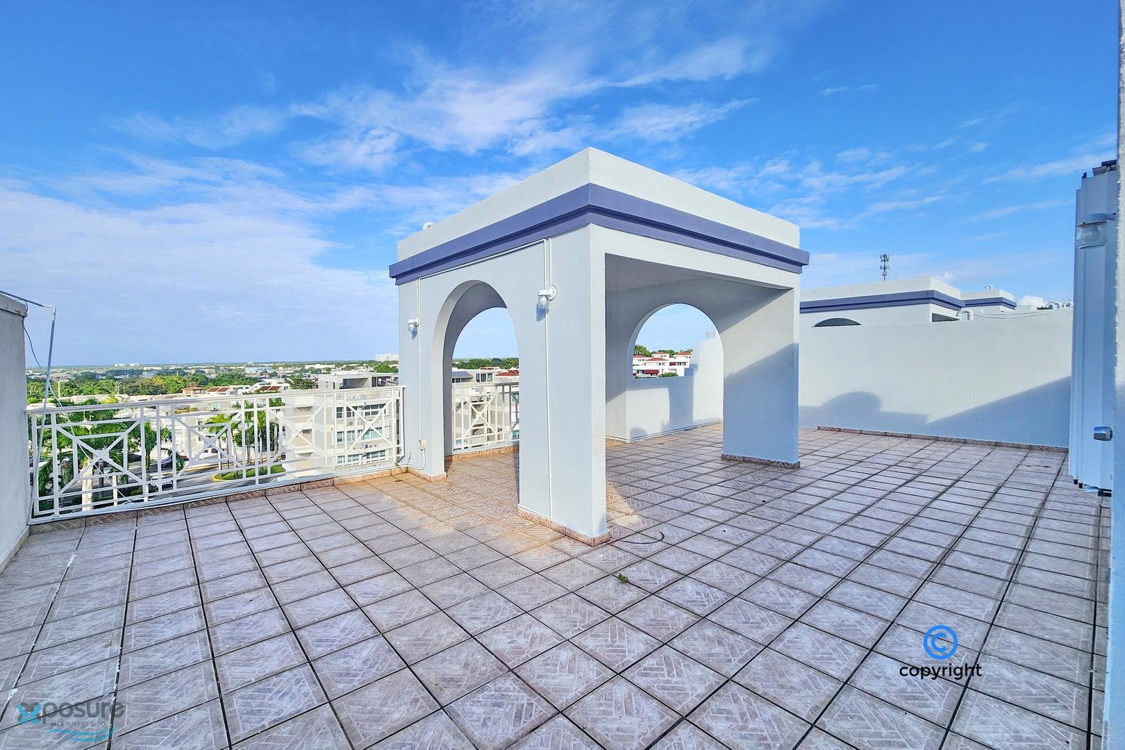 Experience breathtaking ocean, city, airport, and lagoon views from this exceptional penthouse located in the gated Escorial community. This walk-up unit (no elevator) offers approximately 1,460 interior sq. ft. featuring 3 bedrooms and 3 bathrooms, an open concept living and dining area, and a modern kitchen equipped with stainless steel appliances. The property includes 3 mini-split A/C units, 5 ceiling fans, and a private water cistern for added comfort and peace of mind. Enjoy outdoor living with a spacious balcony and an impressive ~850 sq. ft. rooftop terrace, partially covered—perfect for entertaining or relaxing while taking in the views. Includes two assigned tandem parking spaces. Residents enjoy 24-hour security and resort-style amenities such as a community pool, tennis and basketball courts, soccer park, jogging trails, children’s playground, and a beautifully landscaped park with mature trees. Ideally located in the heart of the growing Escorial Restaurant & Shops district, just minutes from Mall of San Juan, 10 minutes to SJU-Luis Muñoz Marín International Airport, and 15 minutes to Isla Verde beach strip, restaurants and hotels. Excellent school district with easy access to major highways and main roads. •HOA: $175/month •Property Tax: approx. $450/year (primary residence) •No short-term rentals allowed •Proof of Funds or bank loan pre-approval required..