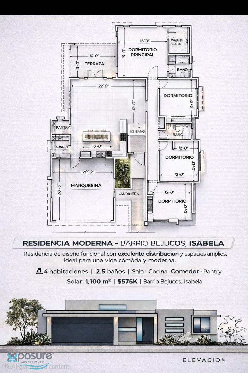 MODERN RESIDENCE IN BARRIO BEJUCOS, ISABELA Live in a functionally designed property with an excellent layout and spacious rooms, ideal for comfortable and modern living. You still have time to choose the finishes and personalize it to your liking. Located in Barrio Bejucos, Isabela. Features: • 4 bedrooms • 2.5 bathrooms • Spacious living room • Modern kitchen with island • Dining room • Pantry • Laundry room • Double carport • Terrace • Walk-in closet in the master bedroom. 1,100 m² lot. Price: $575,000. A property designed for the comfort, privacy, and contemporary style you seek, with the advantage of adapting it to your personal style..
